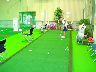 打席前のグリーンはスティンプメータで10.5フィート。トーナメントグリーン並の速さです。打席マットは柔らかめでコースの芝を想定して仕上げています。